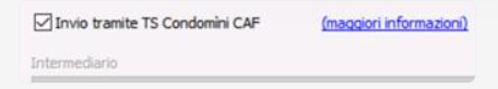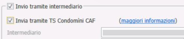 Per l'invio delle CU e 770 spuntare le opzioni Invio tramite Intermediario e Invia tramite TS Condomìni CAF.