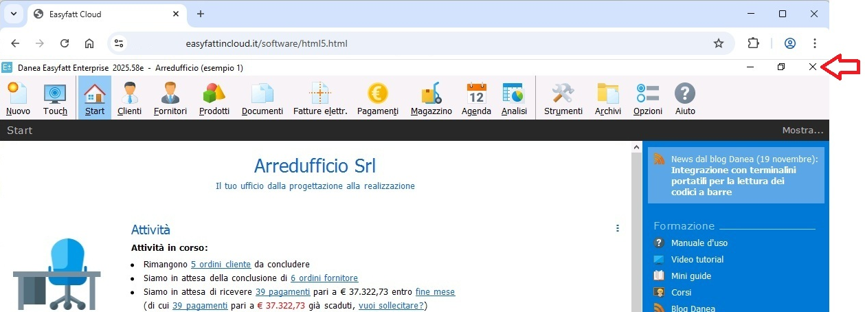 Per assicurare un corretto funzionamento dell'applicazione è necessario chiudere Easyfatt al termine dell'utilizzo quotidiano: non è infatti corretto chiudere la linguetta del browser senza aver prima chiuso l'applicazione.