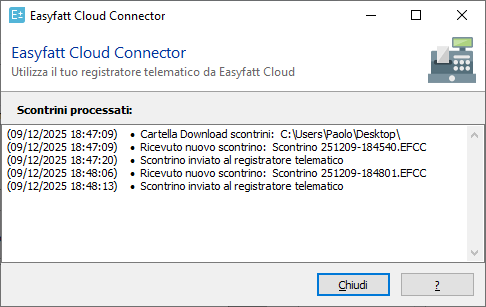 E' necessario eseguire questa operazione solo alla stampa del primo scontrino giornaliero o dopo l'eventuale chiusura di Easyfatt Cloud Connector (ad esempio a causa del riavvio del PC): l'applicazione infatti una volta avviata rimane in esecuzione e invia automaticamente al registratore telematico non solo lo scontrino cliccato ma anche tutti gli scontrini che vengono successivamente stampati da Easyfatt Cloud e scaricati nella cartella Download del PC.